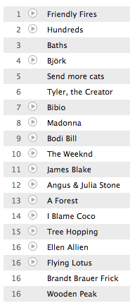 Das neue Album von Friendly Fires, macht mir unglaublich gute Laune. Egal zu welcher Tageszeit. Die FATzig-Scheibe lässt mich nach der Heimat sehnen und der Track von Douglas Greed trifft meine Geschmacksnerven enorm. Eigentlich nur elektronische Glanzlichter auf der Jubiläumsscheibe von Freude am Tanzen. Dann gibt es da ja noch, das Fett in der Zeit ge“featured“te Album von Gabor sprich Robag Wruhme, dass ich irgendwie als einen übermäßig gelungenen Mischmasch aus Pantha du Prince und Matthew Herberts alten Scheiben empfinde, die ich auch gerade ma wieder entdecke. Beides Dreis, soooooo schön! Ganz ganz schön. Björk ist sowieso Alltimefav, aber zur Zeit wieder mehr als sonst. Ebenso wie Madonna, deren 80er und 90er-Tracks bei mir gerade mal wieder voll reinhauen. Ein Hoch deshalb auf die Popnutten! Überraschend und vollkommen weggeflashed hat mich das Baths Ding. Man, das wird wirklich eines meiner Alben in 2011. Und obwohl ich mich lange dagegen gewehrt habe, Tylers Musik und Weeknd-Schnulzen zu hören, (und ich saß durch sie schon vor Monaten direkt an der Quelle) hat mich der Hype jetzt doch erwischt. Und ich swagge wie ein fucking walking paradox, jeden Tag zur Arbeit in ein schickes Kunstmagazin. Ok, ich finds wirklich geil, Sara und JA! ficken auf The Weeknd muss wohl das Großartigste sein. Ich habs begriffen und sicher probier ich’s bald schon aus, weil distance makes the heart grow fonder, ne. Anyway, in der Statistik fehlt noch Nicolas Jaar, dessen Bar25Mix auf Balkonien läuft, während ich mir Hautkrebs zulege. Ebenso will ich die Schnitte von Bodi Bill erwähnen, den ich bei Tape TV so strange fand, dass ich seitdem unbedingt mit ihm schlafen will. Ich höre jetzt die Musik von denen noch öfter als vorher. Dass sie mich nervt, macht mich irgendwie an und ich glaube langsam wirklich, dass ist deren Konzept. Wer von euch will eigentlich nicht mit dem Sänger von BB schlafen?